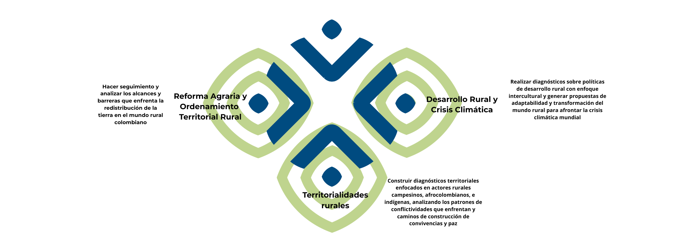 La línea de investigación en Desarrollo Rural y Ordenamiento Territorial del Instituto de Estudios Interculturales (Pontificia Universidad Javeriana, Cali) tiene como objetivo analizar, asesorar, e intervenir desde un enfoque intercultural en procesos de ordenamiento territorial, desarrollo rural, transiciones energéticas, conflictos territoriales, y el fortalecimiento de procesos comunitarios para la promoción de derechos diferenciales de poblaciones rurales indígenas, campesinas, y afrocolombianas.